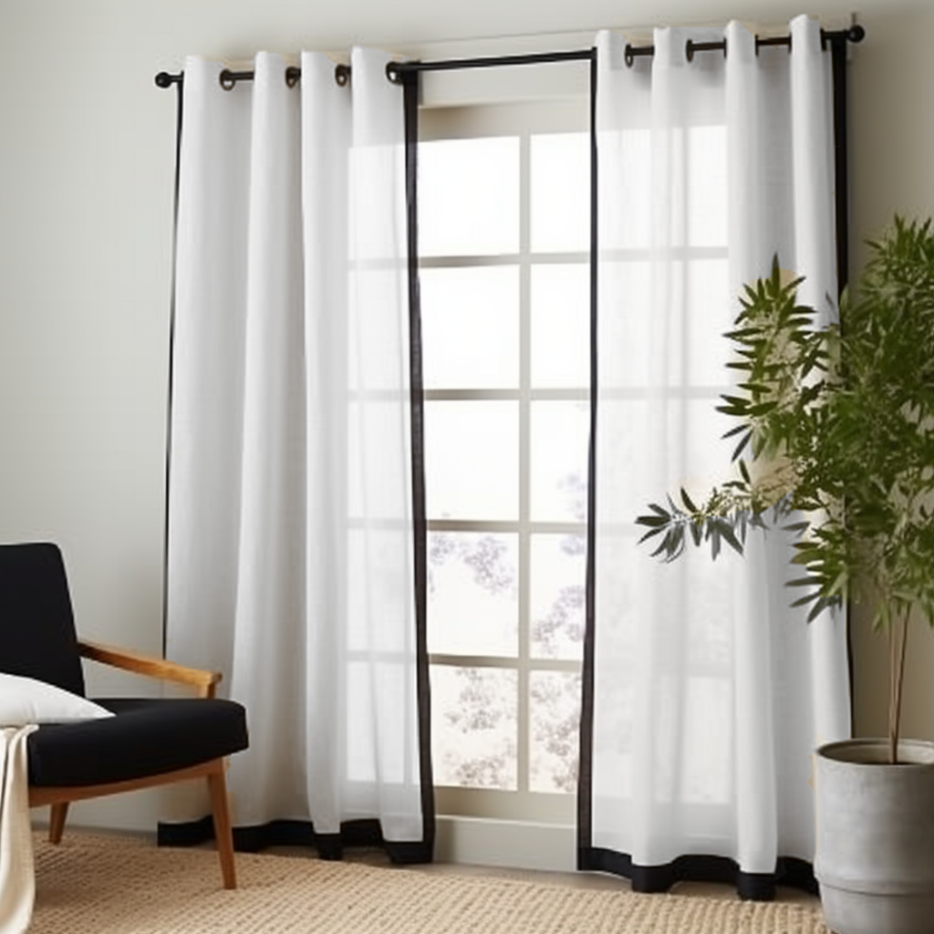 Black and White Frame Border Tab Top Linen Curtain Panel - Custom Width and Length