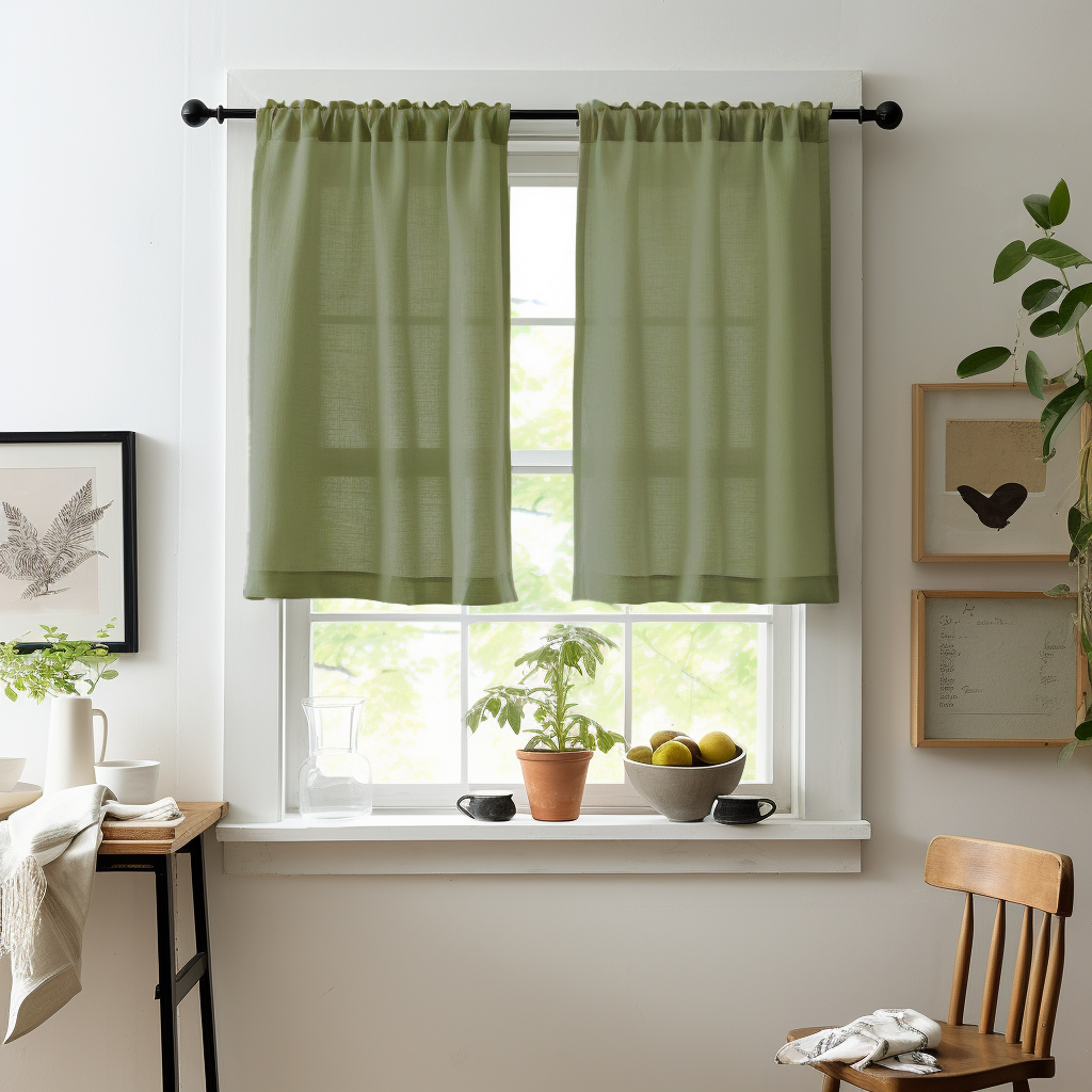 Green Linen Kitchen Cafe Curtains - Heading for Rings and Hooks - Custom Sizes & Colors