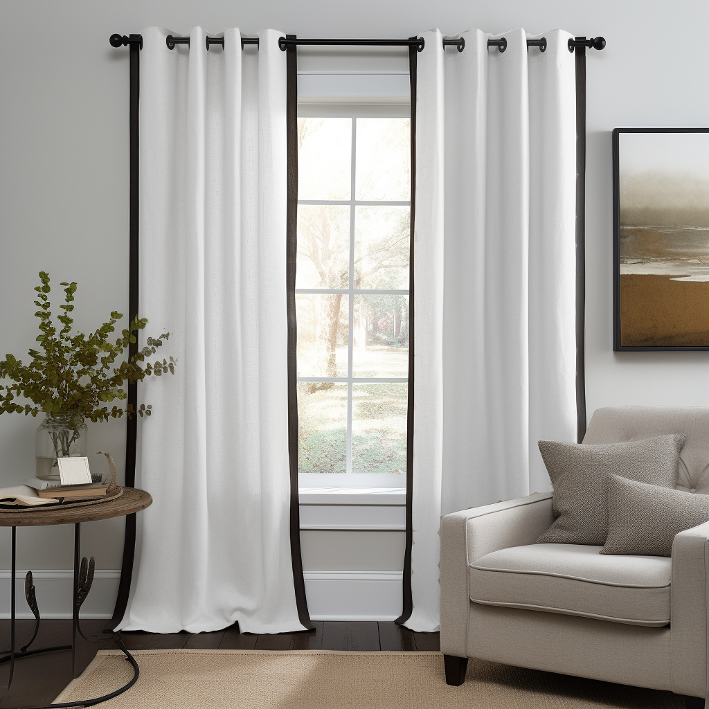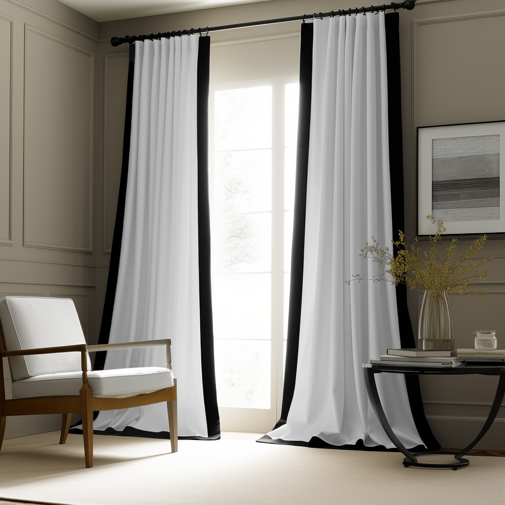Black and White Frame Border Tab Top Linen Curtain Panel with Cotton Lining - Custom Width and Length